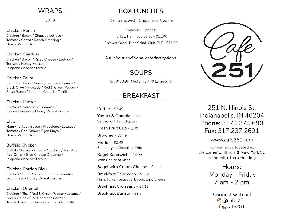 Welcome to Café 251, your delightful retreat nestled in the heart of downtown Indianapolis at 251 N Illinois St. This charming café is more than just a place to grab a bite; it’s a community hub where friendly faces greet you, and a vibrant atmosphere envelops you as you take a seat to enjoy the flavors of carefully crafted dishes.